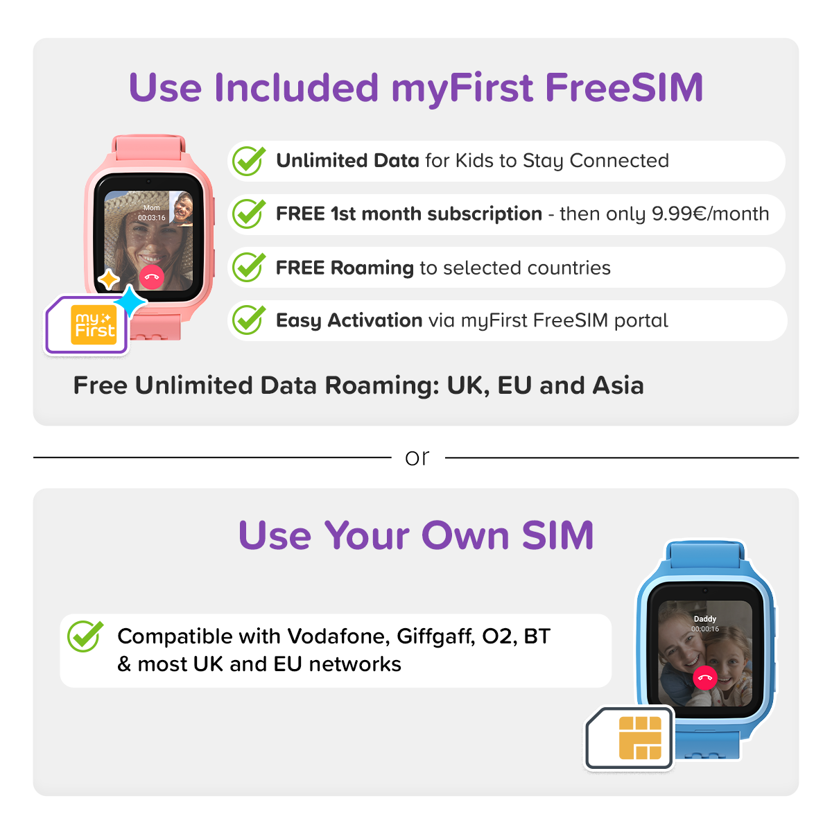 The watch includes a myFirst SIM card plus a free 1-month subscription to get you started