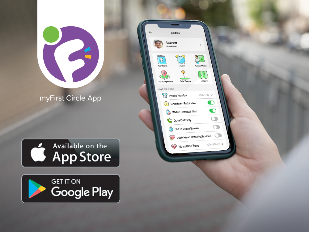 myFirst Fone M1 pairs with the myFirst Circle app, available on both iOS and Android. Parents can monitor, call, message, and manage safety settings directly from their smartphone.