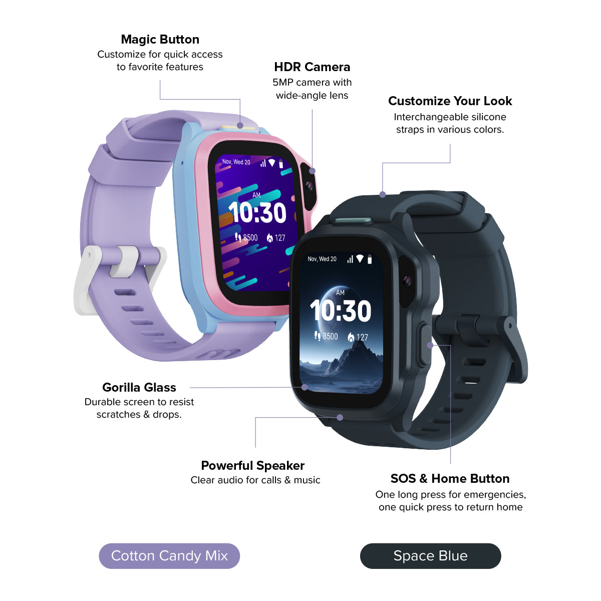 And now, with always-on watch mode allows kids to quickly check the time and date at a glance. Plus, advanced battery-saving technology keeps the fun going all day long.